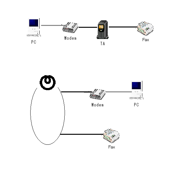 FaxとFax MODEMを直接つないでも通信は出来ない。電話回線には直流の電圧が印加されていることで機器同士が通信できるからだ。TAのアナログポートはほぼNTTの局線と同じ電気条件なのでアナログポートを経由して通信できる。ほとんどのTAがアナログポートを複数持っており、そのアナログポート同士で内線通話が出来る交換機としての機能がある。NTTの回線に繋がっていなくてもこの内線機能は使える。この場合当たり前だが外線にはかからない。もしNTTの契約回線を複数持っているなら、3分10円の支払いさえ覚悟すればNTT経由で同様の機能を実現できる。