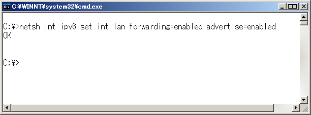 netsh interface ipv6 set interface [interface=]intfacename [forwarding=]enabled と入力する。 既定値は disabled である。