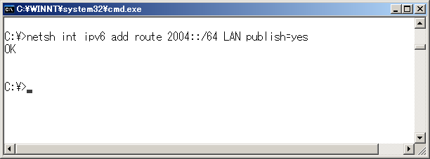 netsh int ipv6 add route [prefix=]<IPv6 addr>/<prefixlength> [interface=]intfacename [publish=]yes と入力する。
