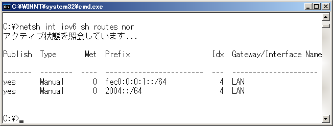今回のネットワークプレフィックスは、2004::/64とする。コマンド プロンプトで