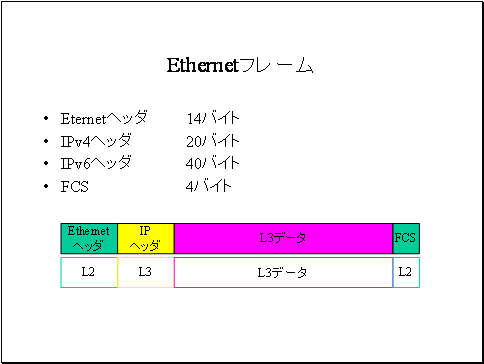 ・IPヘッダとL3データは更に一段下位のデータリンク層のプロトコルでカプセル化されます。イーサネットを使用している場合、イーサネットヘッダとFCSがつきます。イーサネットヘッダからは、IPヘッダとL3データがひとつのL2データとして見えます