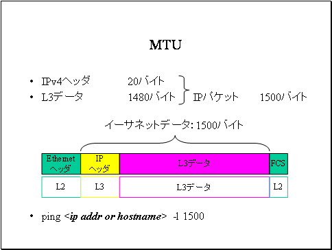 インターネットワーキング上で、IPパケットを分割せずに転送可能なパケットサイズをMTU Max Transfer Unitといいます。