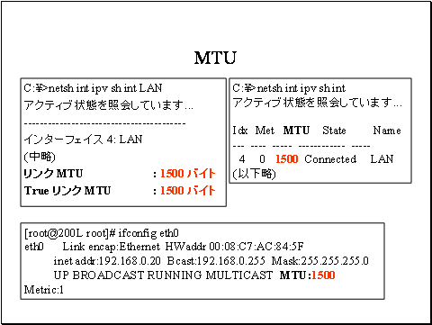 IPv6を有効にしたWindows Server 2003とWindows XPでは、netshコマンドでMTUを確認できます。