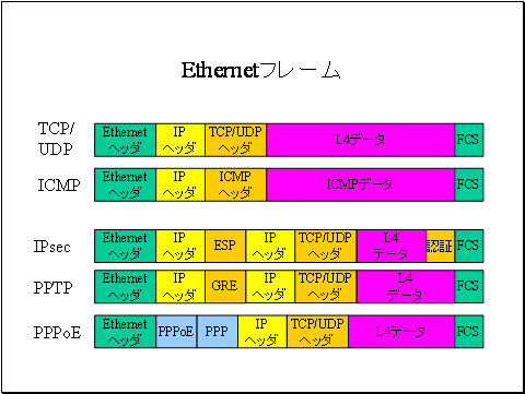 IPsecとPPTPはVPNで利用するプロトコルです。トンネルの始点で標準的なIPパケットをVPN用のプロトコルでカプセル化します。