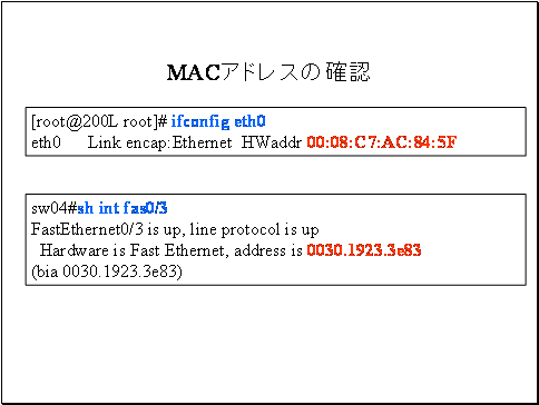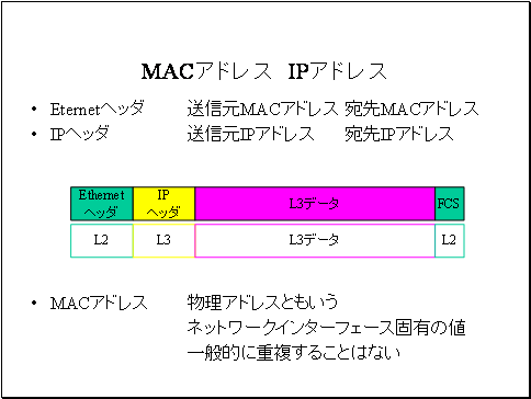 データリンク層のアドレスであるMACアドレスと、ネットワーク層のアドレスであるIPアドレスについて述べます。