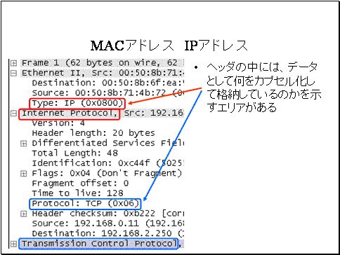 同様に、IPヘッダにも、「データとして何をカプセル化して格納しているのか」を示すエリアがあります。TCPセグメントをカプセル化している場合には、TCPと記述されます。