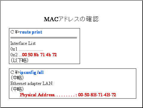 Microsoft OSではroute printやnetstat –rnでルーティングテーブルの表示と共にMACアドレスを確認可能です。Ipconfig /allでも物理アドレスとして表示されます。