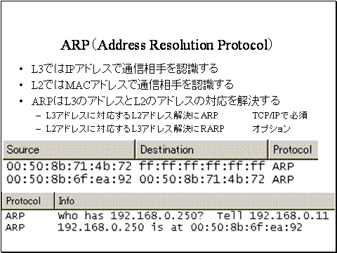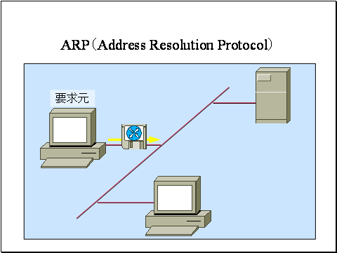 ネットワーク層のプロトコルであるARPは、レイヤ3 ネットワーク層の論理アドレスに対応するレイヤ2 データリンク層の物理アドレスの対応を解決します。またこの解決のプロセスをアドレス解決と呼びます。この機能はTCP/IPで必須です。