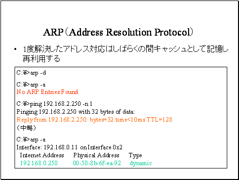 ARPキャッシュにエントリが保持してある間に、宛先IPホストのIPアドレス変更やネットワークカード交換があると、キャッシュ上のIPアドレスとMACアドレスの対応が実際と異なるため、通信に失敗します。