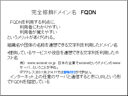 例えば www.axisnet.co.jp      という文字列の場合、このIPホストを設置したエンジニアでなくても、@日本の企業でAaxisnetというドメインのBwwwサーバである、ということが判ります。