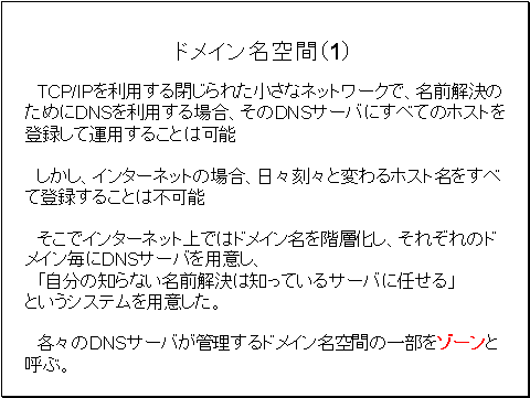 各々のDNSサーバが管理するドメイン名空間の一部をゾーンと呼びます。各々のDNSサーバは自分の管理しているドメインのホスト名とIPアドレスの対応表を保持します。このホスト名とIPアドレスの対応表を格納しているファイルをゾーンファイルと呼びます。