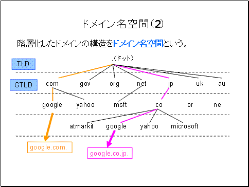 ドメイン名空間の構造・規則としてトップレベルドメイン TLDをどっと一つで表します。Unix互換OSrootをスラッシュ1つで表すのに似ていますね。