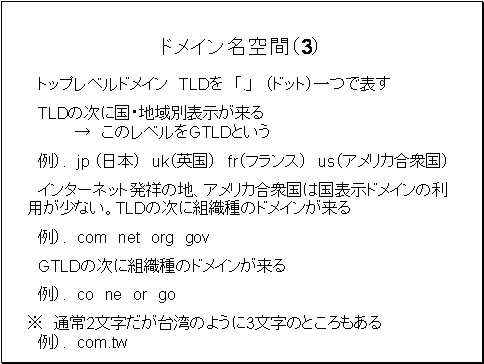 gTLDの次にco ne or go組織種のドメインが来ます。組織種のドメインは通常2文字ですが、アメリカ合衆国や台湾のように3文字のところもあります。