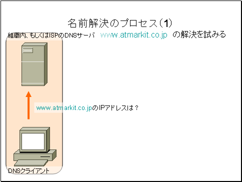 ユーザーが操作しているPCwww.atmarkit.co.jpというホストのIPアドレスを、ユーザ組織内のDNSサーバ、もしくは加入しているISPDNSサーバに問い合わせます。