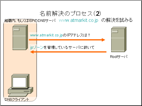 ユーザ組織内のDNSサーバ、もしくは加入しているISPDNSサーバは、rootサーバに対してwww.atmarkit.co.jpIPアドレスを問い合わせます。