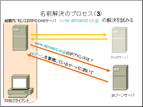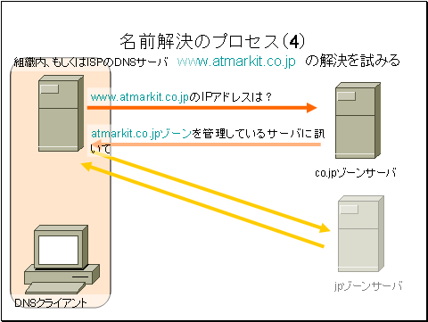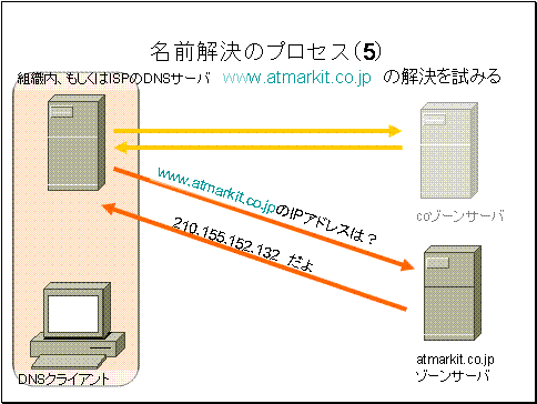 そこでユーザ組織内のDNSサーバ、もしくはISPDNSサーバは、atmarkit.co.jpソーンのDNSサーバへwww.atmarkit.co.jpIPアドレスを問い合わせます。