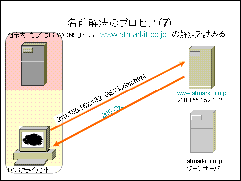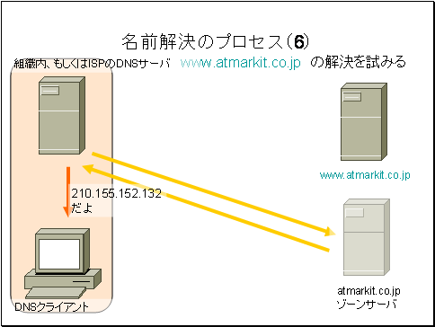 ユーザ組織内のDNSサーバ、もしくはISPDNSサーバは、回答を得たのでwww.atmarkit.co.jpIPアドレスを問い合わせ元のクライアントに返します。