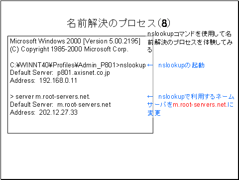 nslookupコマンドを利用すると名前解決のプロセスが体験できます。(実際には名前解決ではなくDNSサーバの持つ情報の検索となります。)
