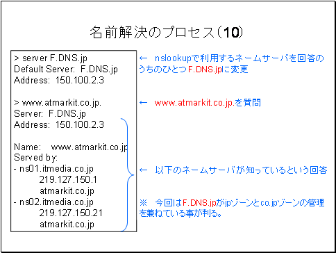 また、atmarkit.co.jpを管理しているDNSサーバを回答してきたことからF.DNS.jpjpゾーンとco.jpゾーンの管理を兼ねている事が判ります。