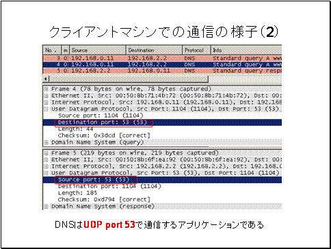 また名前解決クエリとクエリ結果(レスポンス)のパケットを見ると、DNSサーバのUDPポート53番を利用している事がわかります。