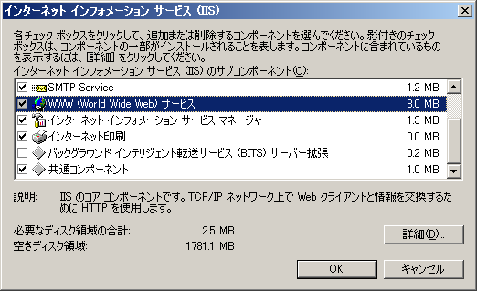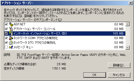 4. 「インターネットインフォメーションサービス」を選択し、「詳細」をクリック。