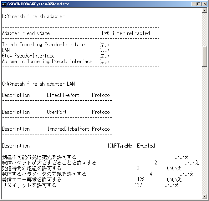 で確認できる。アダプタ名を指定した場合としない場合で表示内容が異なる。アダプタ名を省略するとfiltering状態を、アダプタ名を指定するとそのアダプタのICMP設定が表示される。