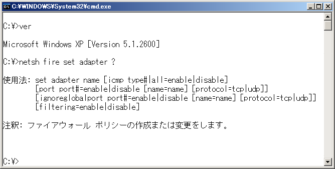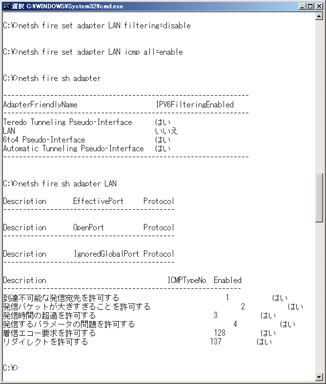 2003年の7月に脆弱性としてMicrosoftが発表していたにもかかわらず、一ヵ月後の8月にMSBlasterが大発生した。このことを教訓としてMicrosoftデフォルトセキュアーの一環で、FirewallをデフォルトONに設定した。Windows Updateをまめに適用していても、filtering設定だけでなく ICMP設定がデフォルトでかかるようになった。Windows Xpを2004年04月14日現在の最新状態にすると、次のコマンドを実行して設定変更しないとpingが失敗する。