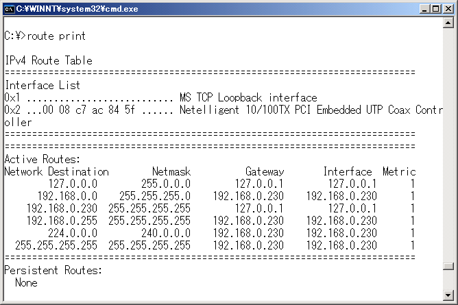 でデフォルトゲートウェイが設定できる。設定したらroute printで確認する。