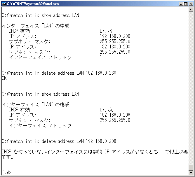 deleteコマンドで静的に設定してあるアドレスを削除できる。IPアドレスは必ず1つは必要なので、すべてのアドレスの削除はできない。
