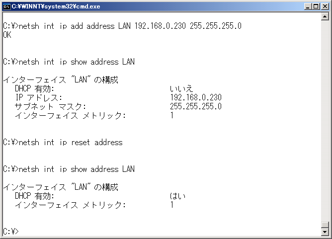 resetコマンドを使用すると、インターフェースの設定をリセットできる。Windows はデフォルトでDHCPクライアントとして構成されるので、インターフェースをリセットすると、性的に設定されたアドレスは削除され、DHCPクライアントとして構成される。
