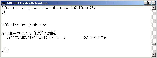 DNSサーバー同様、netsh int ip set wins intfacename static ipaddrで、インターフェースが参照するWINSサーバーアドレスを設定できる。