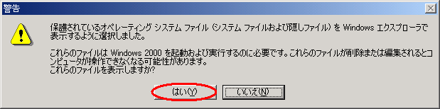 「保護ざれたオペレーティングシステムファイルを表示しない」チェックボックスのチェックを外すと、 メセージボックスが表示される。しかし、あなたは「エンドユーザーのお守りをする役」なので、 「システムファイルを表示する設定」にしておく為、メッセージに対しては「はい(Y)」で答える。