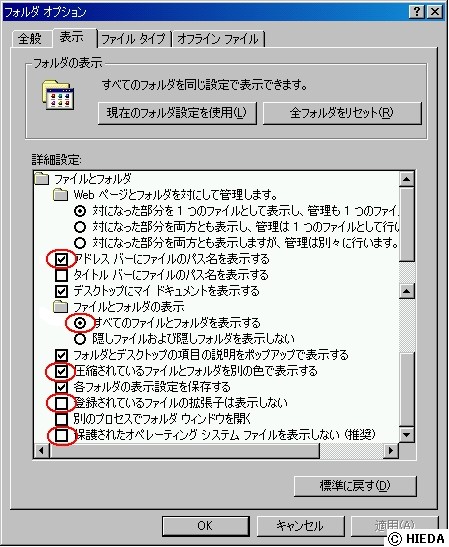 「フォルダオプション」の「表示」タブを開き、5ヵ所のチェックを変更する。