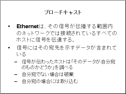 Ethernet はその信号が伝播する範囲内のネットワークでは、接続されているすべてのホストに信号を伝達します。このようなネットワーク上の全てのホストに信号を伝える動作・状況を「ブロードキャスト」型ネットワークといいます。
