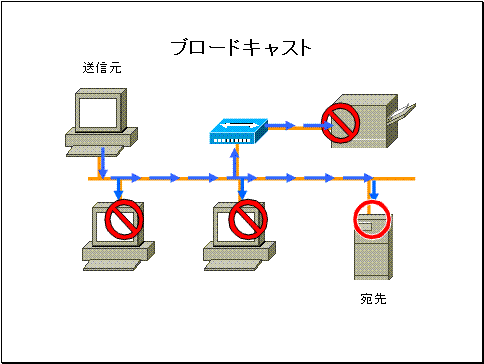 「単一宛先への信号 ユニキャストトラフィック」を宛先ホストだけでなく、その信号が伝播する範囲内のネットワークに接続されているすべてのホストに信号を伝達します。