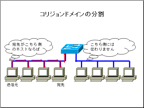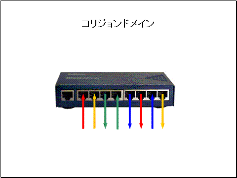 宛先のないポートには信号を送出しないので、あるポートに接続しているネットワーク上でのコリジョンを、他のポートにつながっているネットワークに伝播しません。