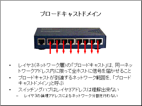 スイッチングHUBは論理アドレスによるネットワーク分割を行わないので、スイッチングHUBでは、レイヤ3のブロードキャスト信号は全てのポートに送出されます。