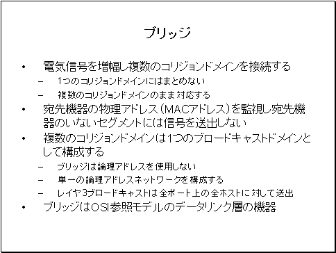 ブリッジは電気信号を増幅し複数のコリジョンドメインを接続します。ただし、1つのコリジョンドメインにはまとめず、複数のコリジョンドメインのまま対応します。