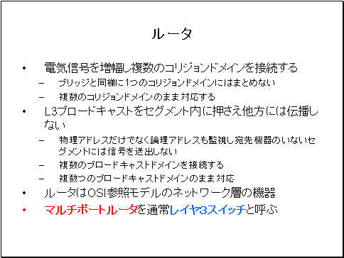 ルータは電気信号を増幅し複数のコリジョンドメインを接続しますが、ブリッジと同様に1つのコリジョンドメインにはまとめず、複数のコリジョンドメインのまま対応します。