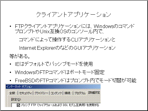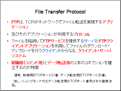 FTPはTCP/IPネットワークでファイル転送を実現する標準アプリケーションです。しかし、最近はインターネット上ではHTTP等を利用してファイル転送を行うことも多いですし、LAN内ではWindowsのCIFS(Common internet file system = SMB Server Message Block)を利用する事が多いでしょう。