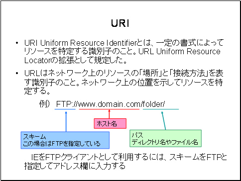 IEをFTPクライアントとして利用するには、スキームにFTPとプロトコルを指定して、アドレス欄にFTP://www.domain.com/folder/と入力します