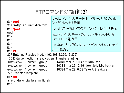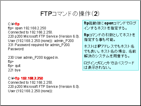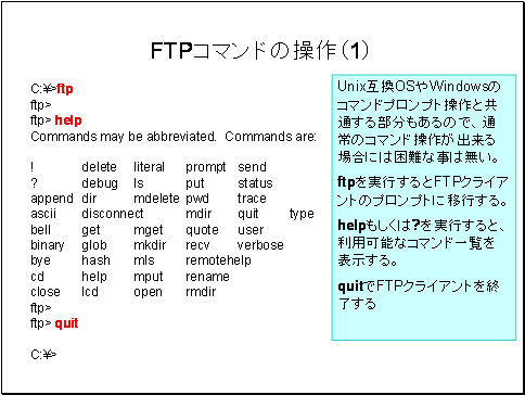 FTPコマンドを実行してみましょう。Unix互換OSやWindowsのコマンドプロンプト操作と共通する部分もあるので、通常のコマンド操作が出来る場合には困難な事は無いでしょう。