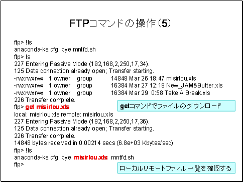 lsコマンドはリモートのカレントディレクトリ内ファイル一覧を表示します。Unix互換OSでもファイルリスト表示はlsコマンドでした。