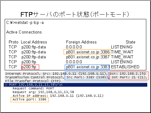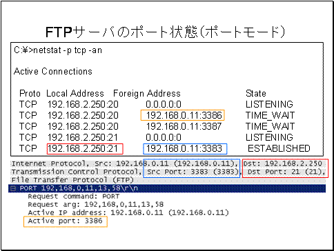 データ転送用セッションは、サーバがTCPポート20、クライアントが通知どおりの3386を利用していました。netstatコマンドの実行がデータ転送後のセッションが閉じた直後でした。