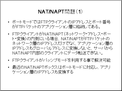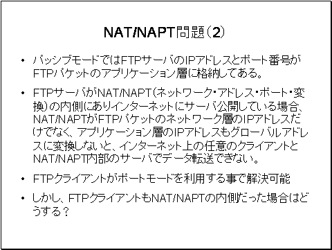 FTPクライアントがNAT/NAPTの内側にいる場合、NAT/NAPTがFTPパケットのネットワーク層のIPアドレスだけでなく、アプリケーション層のIPアドレスもグローバルアドレスに変換しないと、インターネット上のFTPサーバからNAT/NAPT内部のクライアントにデータ転送ができません。