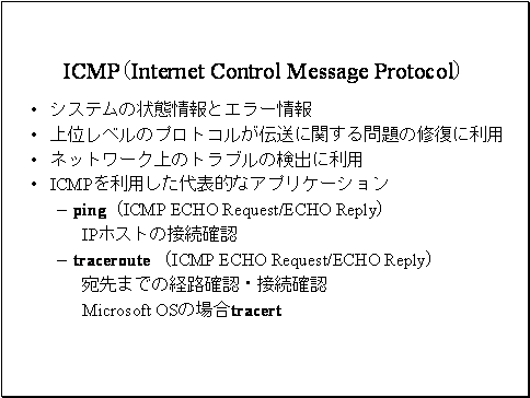 ICMPもネットワーク層のプロトコルです。ICMPは通信を試みた時にシステムの状態情報とエラー情報を通知します。この通知情報を上位レベルのプロトコルが伝送に関する問題の修復に利用します。主にネットワーク上のトラブルの検出に利用するプロトコルです。