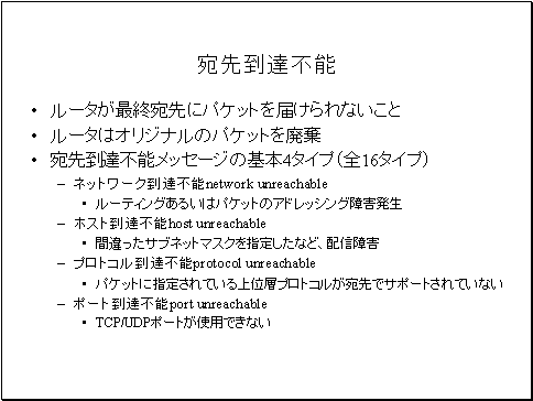 · ポート到達不能port unreachableも、宛先ホストにIPパケットは届いているものの、サービスが停止しているなどTCP/UDPポートが使用できない場合に発生します。