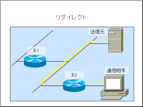 そこでR1は「通信相手の属するネットワークへの出入り口はR2である。」というICMPリダイレクトメッセージを送信元に通知します。