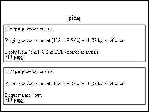 上の画面は時間超過メッセージの例です。IPパケットは無限ループを防止するためTTL Time to liveという値を持っています。この値はルータを1台経る毎に1つ減ります。この例ではIPアドレス192.168.5.60を持つホストに到達する前にTTLを消費しました。
