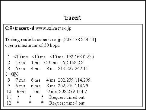 セキュリティ上の理由でICMPトラフィックをフィルタしているネットワーク機器も多いので、tracertコマンドで結果が得られない・Request time outが表示される、からと言ってネットワークに障害が有るとはいえません。